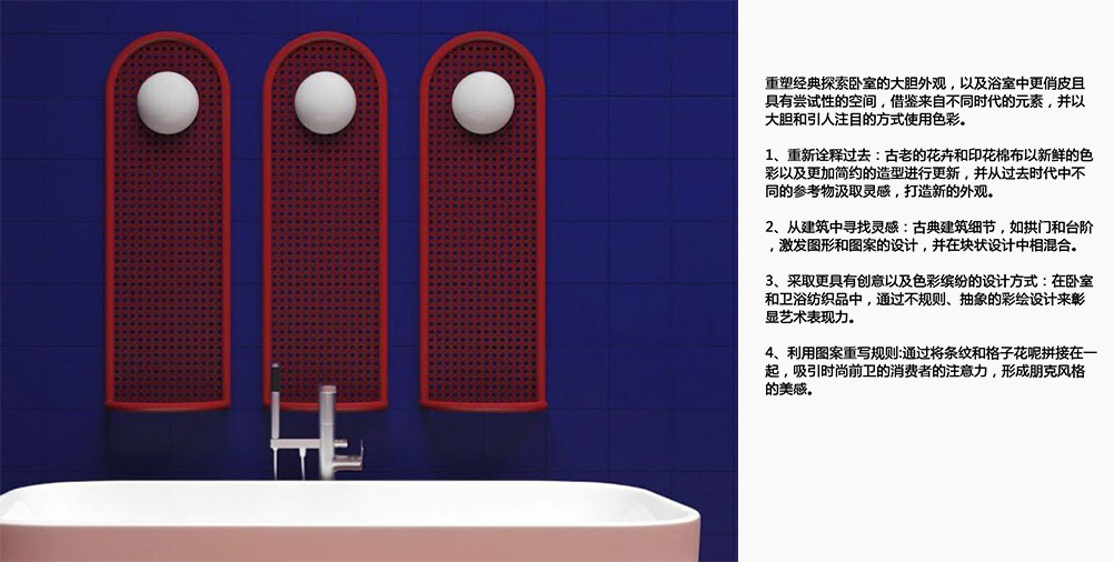 重塑經典探索臥室的大膽外觀,以及浴室中更俏皮且具有嘗試性的空間,借鑒來自不同時代的元素,并以大膽和引人注目的方式使用色彩。